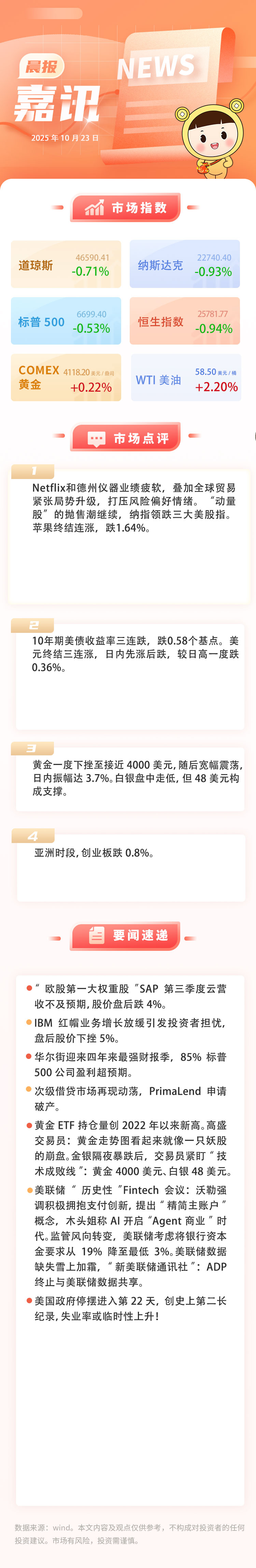 10月23日嘉讯:纳指领跌三大美股指,美元终结三连涨