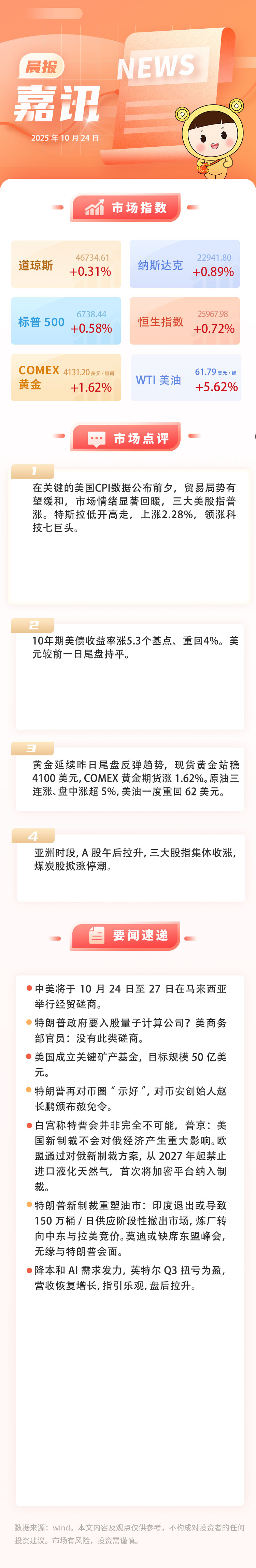 10月24日嘉讯:三大美股指普涨,原油三连涨