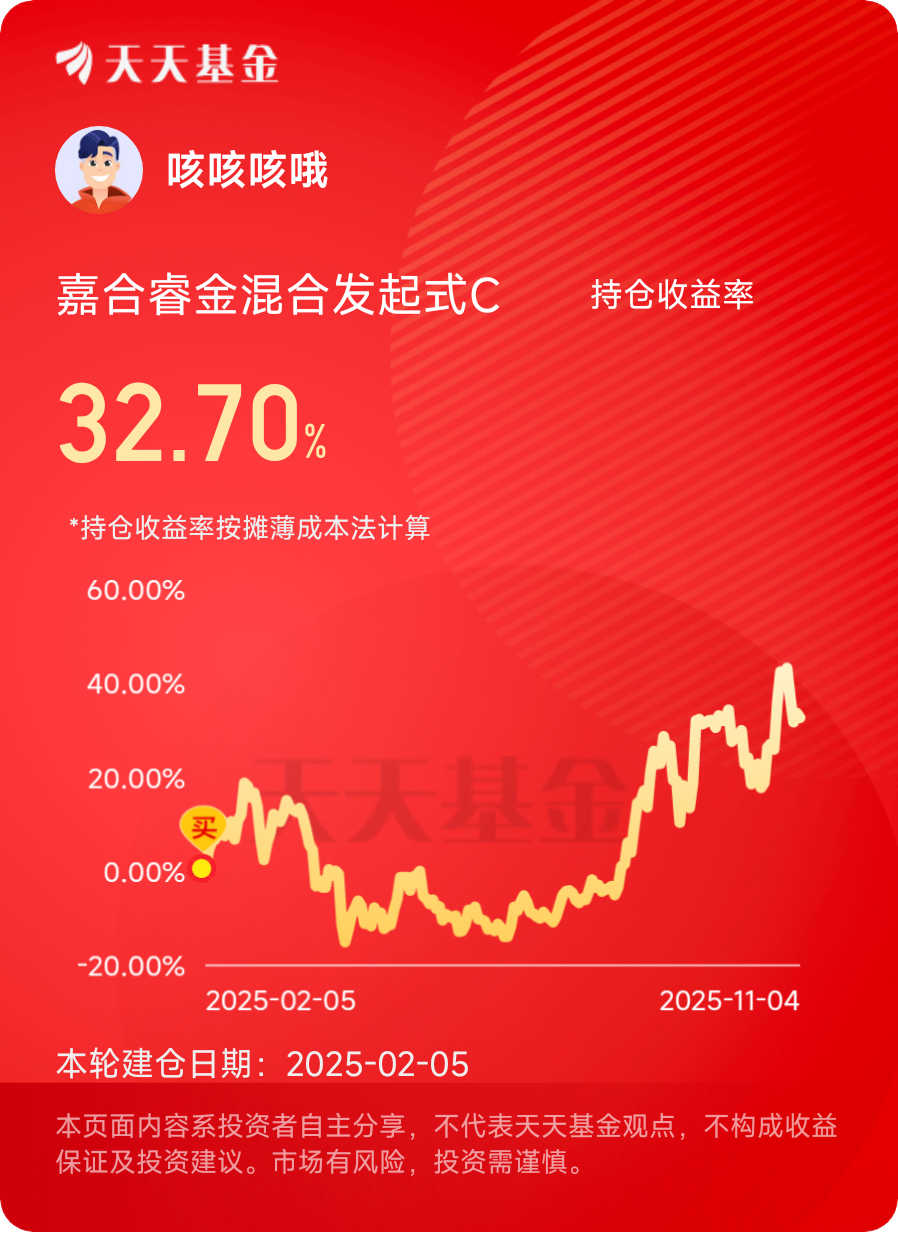 #11月基金投资策略# @平平淡淡来理财 @布加没有迪 对嘉合睿金混合发起式C(005091)的投资,我的核心感悟在于其 “发起式”结构带来的利益绑定以及灵活策略对波动的平滑作用。基金经理通过多策略模型动态调整股债配置,并侧重布局电子、AI算力等成长领域,力求在控制回撤的同时捕捉超额收益。不过,基金近一年高达-28.46%的最大回撤也提示了其高风险属性。