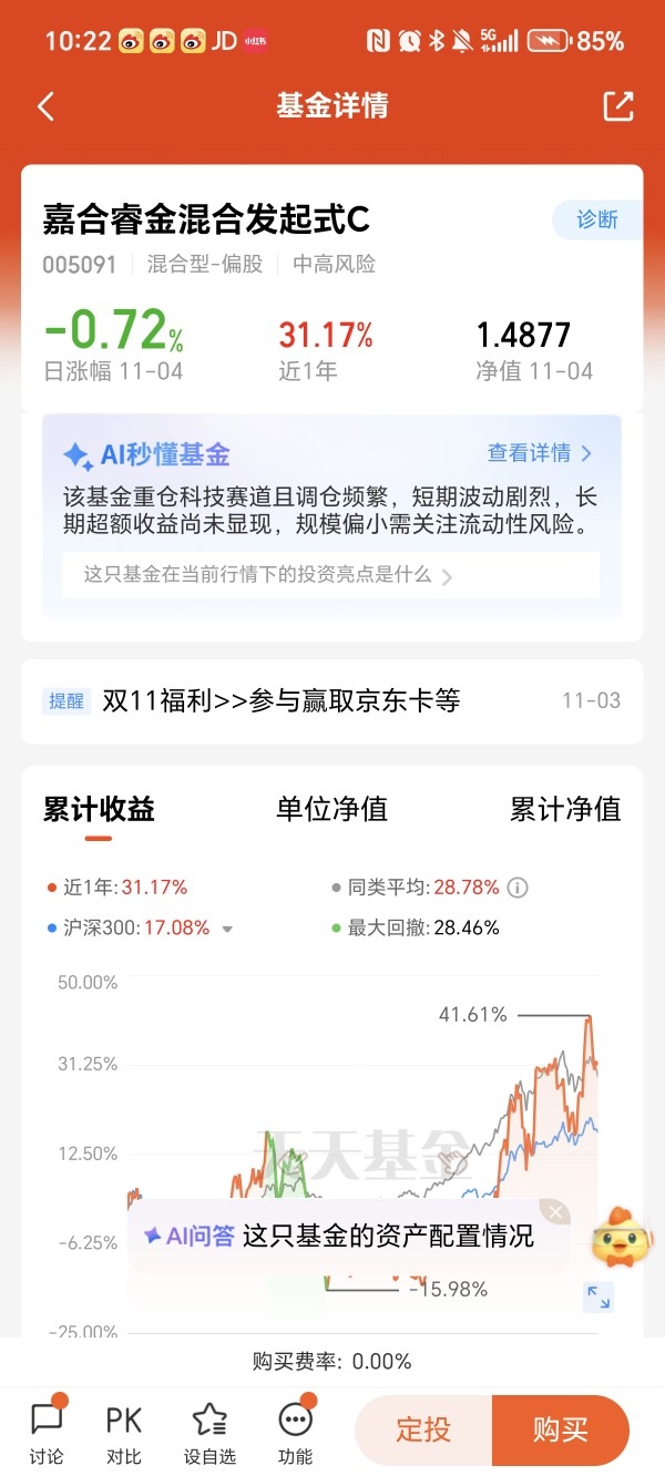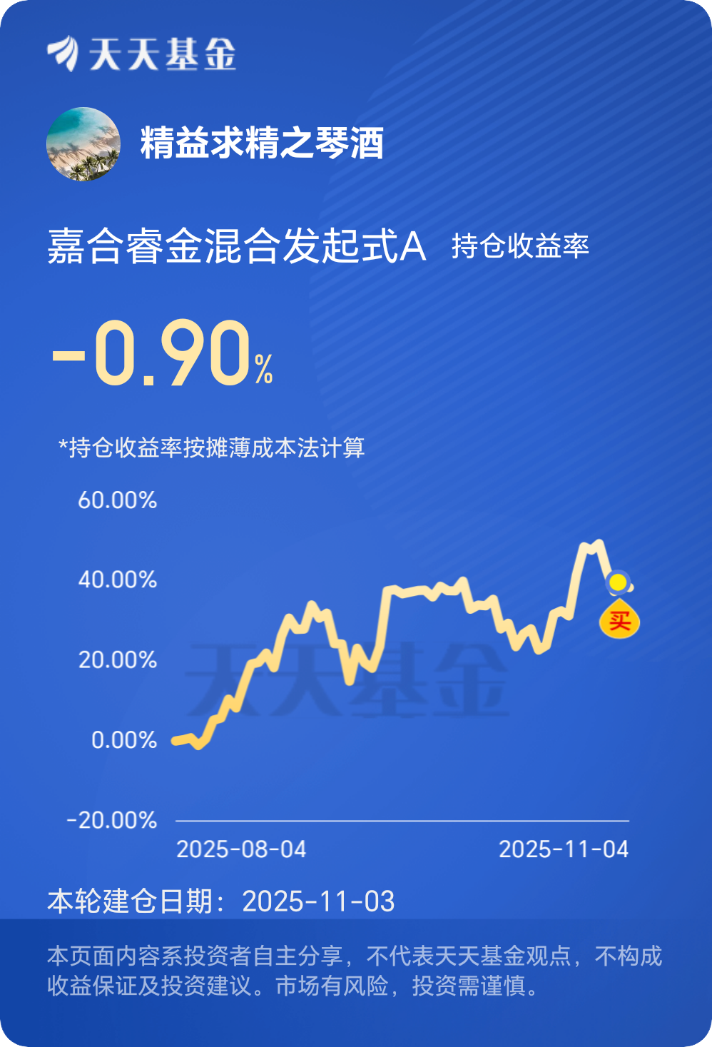 #11月基金投资策略# #11月基金投资策略# 嘉合睿金:我的“震荡市定心丸”,11月市场先抑后扬的预期渐浓,对我这种怕追高又求稳的投资者来说,持仓里的嘉合睿金混合C成了最踏实的存在。去年跟风买科技基金亏怕后,表姐推荐的这只“固收打底+权益分散”的基金,至今已带来12.8%的收益,彻底改变了我的理财观。