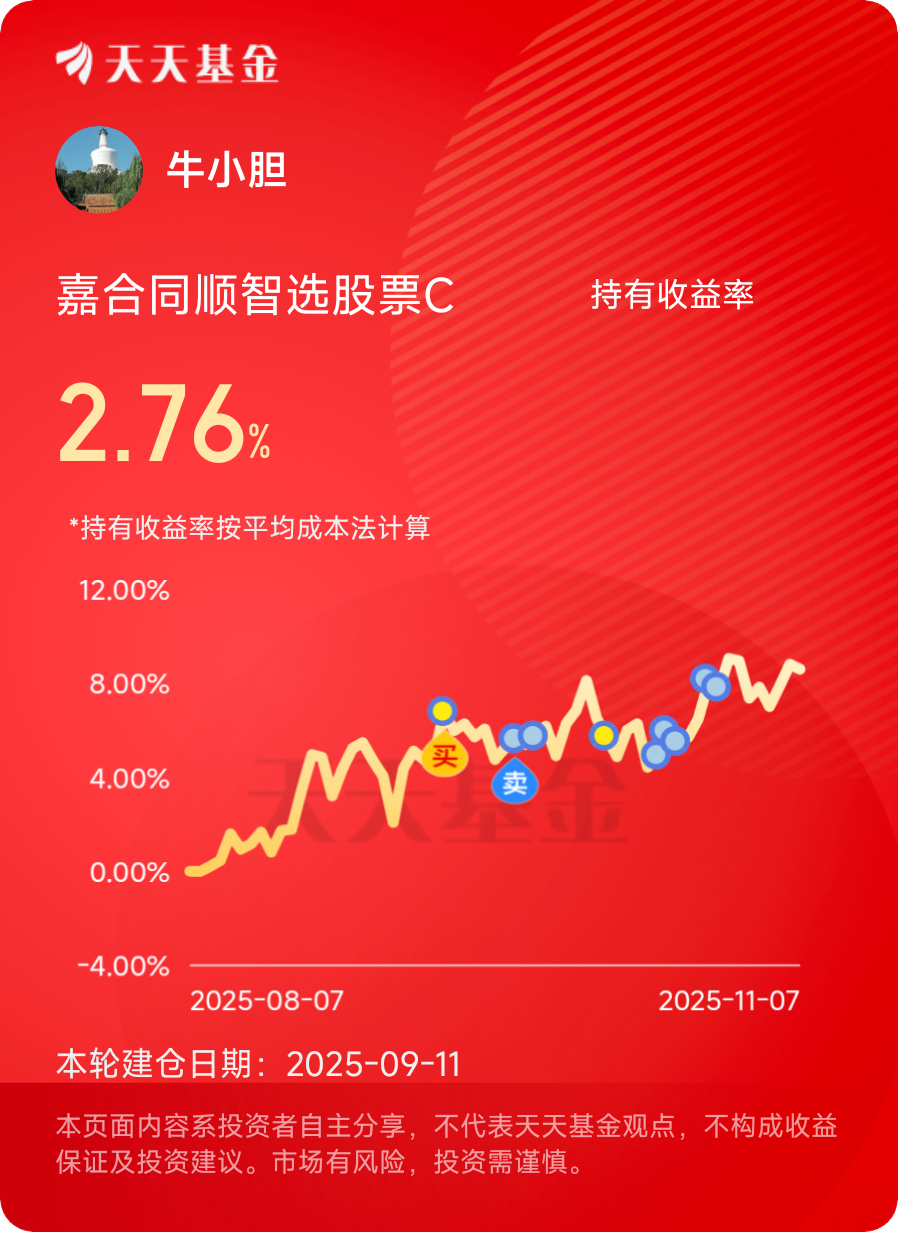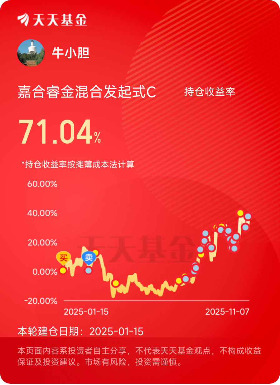 身边也有朋友问我,这么波动的基金,拿着不闹心吗?我总是笑着回答:“闹心过,但现在更多的是安心。”因为我知道,对于嘉合睿金混合C这样爆发力强的基金,短期波动是正常的,而长期持有+定投,就是驯服波动的最佳方式。它就像一匹“烈马”,虽然桀骜不驯,但只要找对了驾驭方法,就能带你跑得更远。$嘉合锦鹏添利混合C$