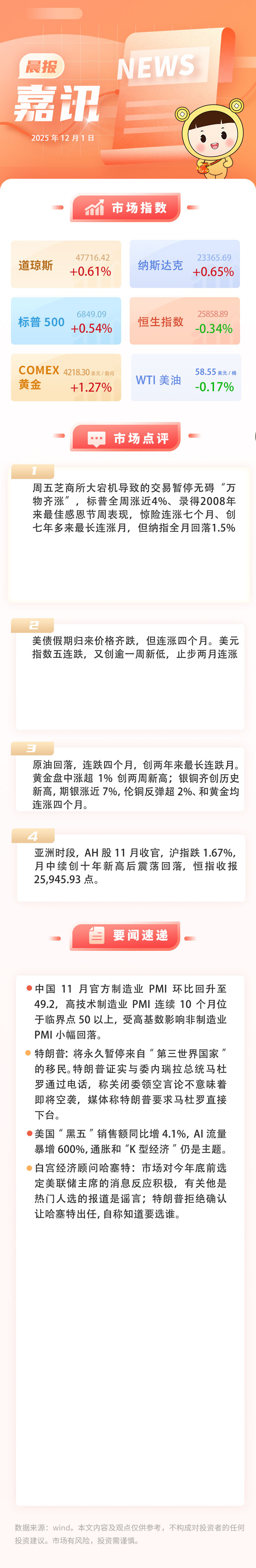12月1日嘉讯:美元指数五连跌,原油回落