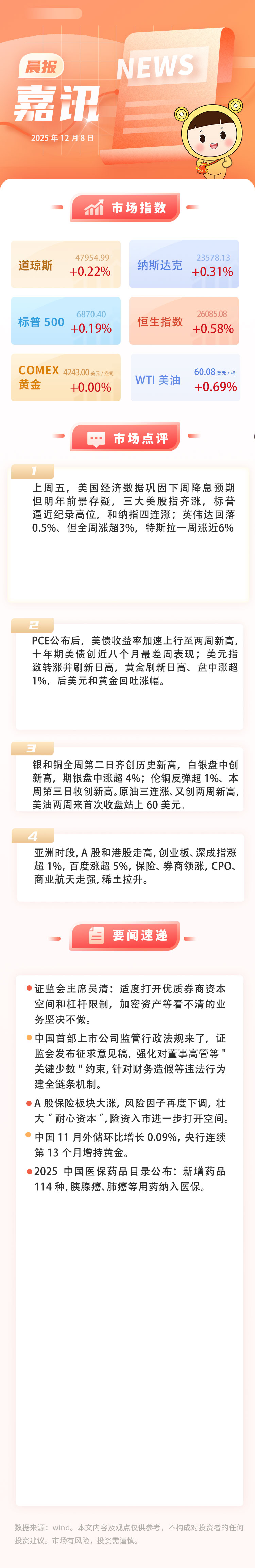 12月8日嘉讯:三大美股指齐涨,白银盘中创新高