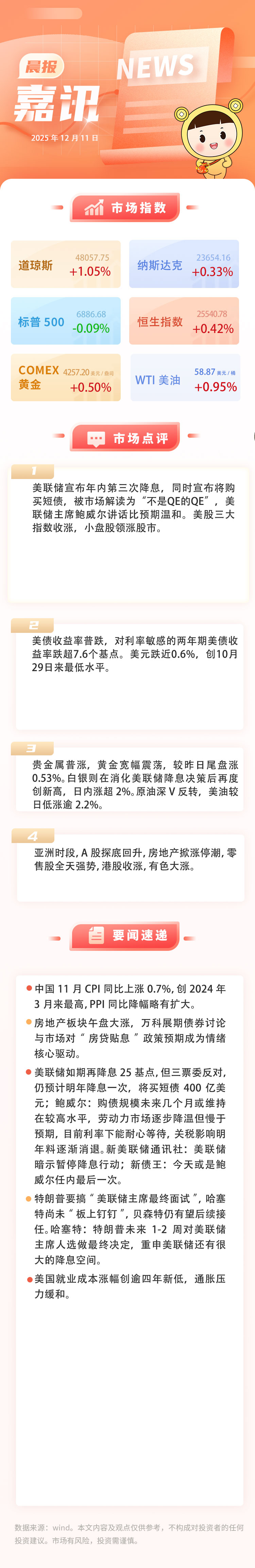 12月11日嘉讯:美联储宣布年内第三次降息,原油深V反转