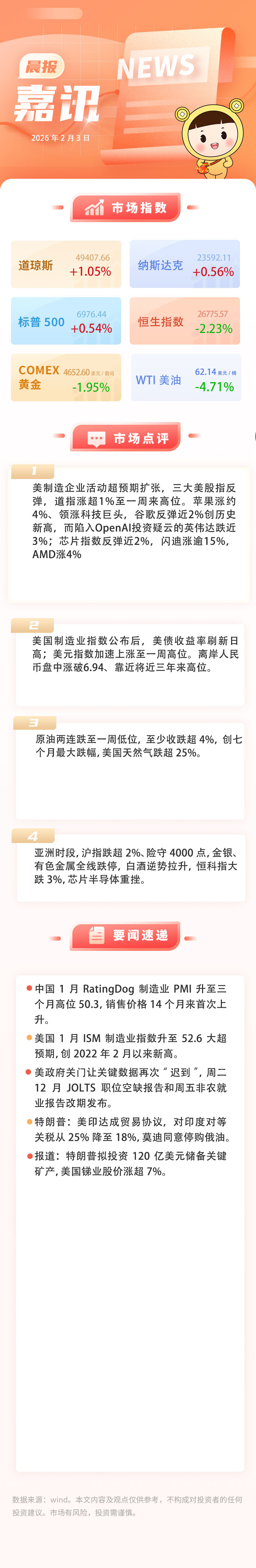 2月3日嘉讯:三大美股指反弹,原油两连跌至一周低位