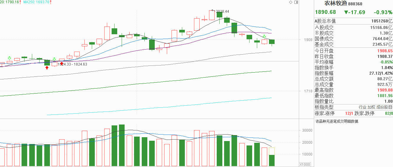 家人们,看看农业昨天那表现!小阳反弹力度不大未能收复5天线,今天5天线继续下行压制,农业出现小阴调整我认为是正常的。今天阴线力度目前看是强于昨天阳线,说明抛压还是比买盘多,农业在短周期内还是下行波动周期。从走势图看,农业目前离60天线已经很近了,与其在当下位置抵抗,还不如先回落至60天线测试一下支撑力度,如果60天线有支撑,重新看好做多就行了,但如果60天线还是没有支撑,就得注意是不是有大资金持续流出。至于流出的原因,我认为是科技风格对市场的虹吸效应扩大了,农业作为消费的一员,虽然不及白酒那样有强流动性资金池,可风口来了农业又不涨的话,场内筹码在赚钱效应的带动下并不排除主动选择离开农业选择景气度更高的行业,所以没有资金流入前,农业也就这样了。