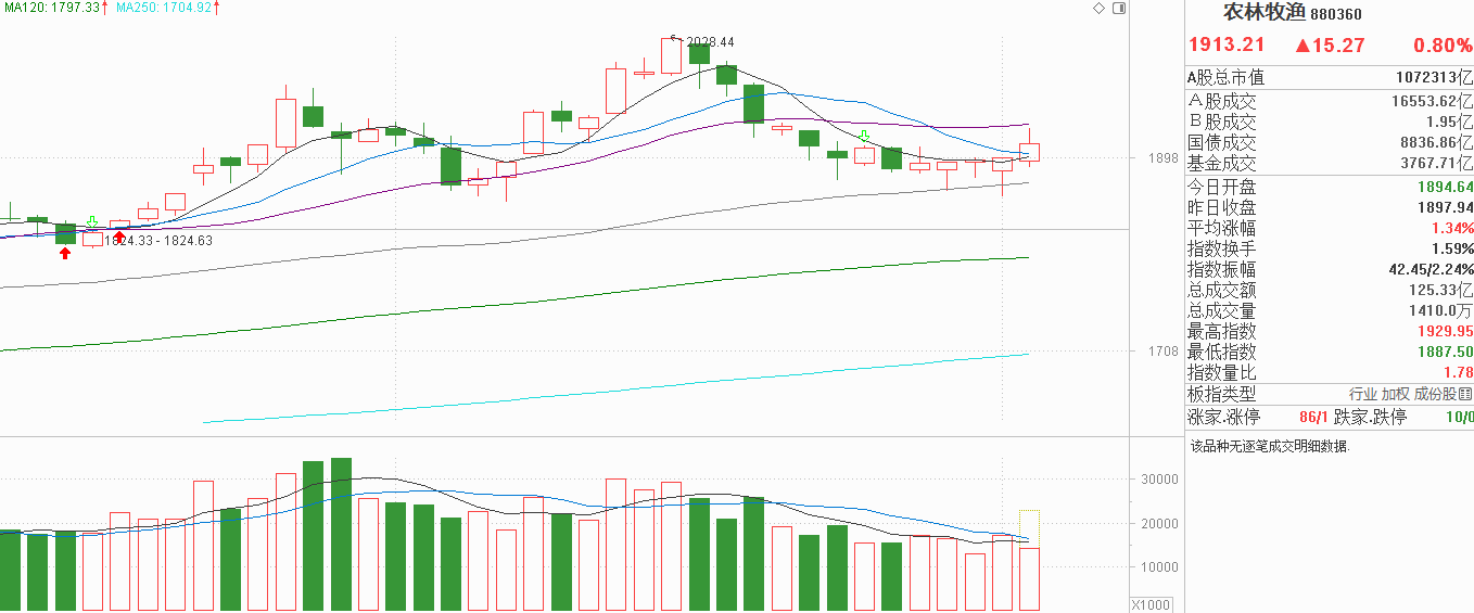 家人们,聚焦农业!农业昨天一度小阴调整回踩60天线,下影线比9月29号还要长,昨天我认为农业的下行是没有道理的,因为农业本身没有资金流入,在9月15号见高后几乎单边回落再回到8月平台即60天线附近,筹码没获利下行压力本身就不大。结果尾盘探底回升还收在5天线上方,连续一周都在5天线下方震荡,5天线的压力片段也是没有了,平台的构建反倒是明确了,当前位置就是农业板块的箱底区域。今天农业小阳反弹走高,我认为是开始尝试脱离箱底再走波段,如果明天没有回落,本次农业见低回升的概率就很大。先不论是否能创新高,只要能在箱体内波动,箱底潜伏等待反弹的性价比是很高的,在科技震荡剧烈的情况下,农业或许能作为消费低迷下的一个替代补充。