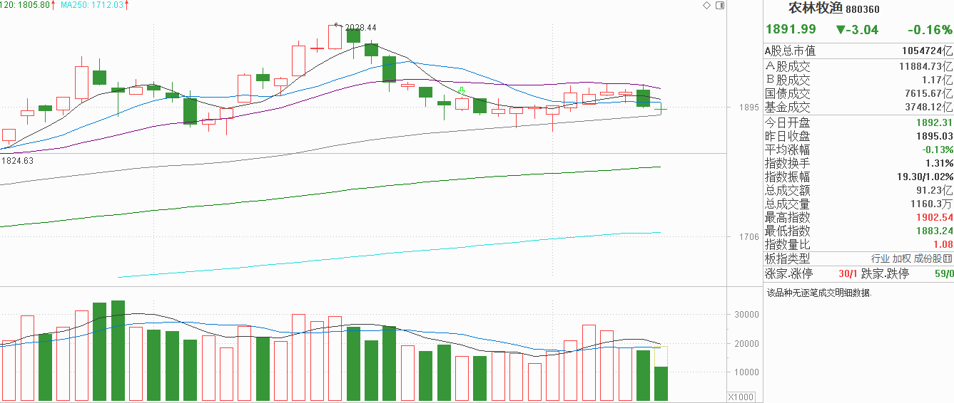 家人们,今天必须给大家好好说说农业最近到底在经历啥鬼事!昨天冲高至20天线后小阴回落,把10天线击穿了,今天低七冲高10天线后又回落至60天线,连续两天走弱依然在20天线与60天线的区间内波动,实际上就是场内资金继续流出的信号,不过农业自9月26号横盘震荡至今,说白了就是没有新增资金流入市场,场内抛压已经消化完毕又没有做空动力。就算节后指数出现巨幅波动农业依然不为所动,说明的确是跌无可跌。昨天和今天的回调,把当前的平衡打破了,也就是说连抛压已经出清的农业也受不了近两天市场缩量下的走弱出现情绪式下行,已经不是技术层面的问题,而是整个市场情绪面的问题。虽然农业是防守品种而且没有抛压了,在当下情绪低迷的实际影响下表现偏弱,可以反推其它板块做多资金已经全部消失,到底什么时候回暖,也可以观察农业何时重新回到正常的窄幅震荡状态,农业可以作为其它题材拐点出现的一个观察点。