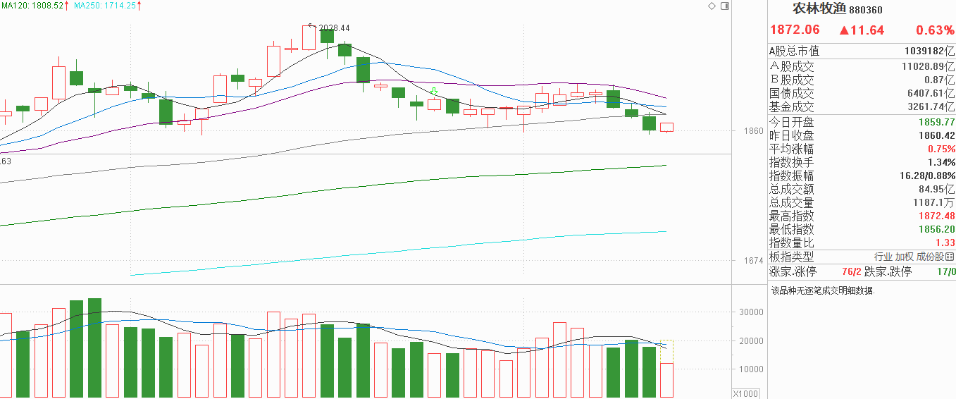 家人们,农业昨天干啥了?小阴调整失守60天线回到10月9号下影线的低点下方轻微跌破,如果做多主力是有防守的,今天农业就应该出现小阳反包昨天的失地甚至突破60天线,但农业目前只是窄幅震荡,我感觉不出农业的资金正在做多。最近一个月我指出,农业板块完全没有资金的参与,是抛压出清后的自然震荡,因此10月初指数出现巨震对农业板块没有任何影响,毕竟没有获利盘就没有抛压,没有买盘就维持横向震荡结构。不过这情况在上周五就发生改变,农业小阴调整击穿60天线,昨天继续下行形成三连阴,虽然不是中阴调整,但也属于资金的持续外流,由于此前没有资金流入,现在外流的资金肯定是原来认为农业能企稳继续做多,但后来觉得农业要走弱产生的止损筹码,对于止损盘,市场情绪是影响是很大的,近期市场情绪低迷成交量每天都在萎缩,对农业企稳是一个非常大的负面影响,只要成交量继续萎缩,那怕今天农业有反弹,我觉得并不会改变这些止损筹码的态度,未企稳前我会继续观望,并不是因为三连阴后出现微涨就认为农业企稳了。