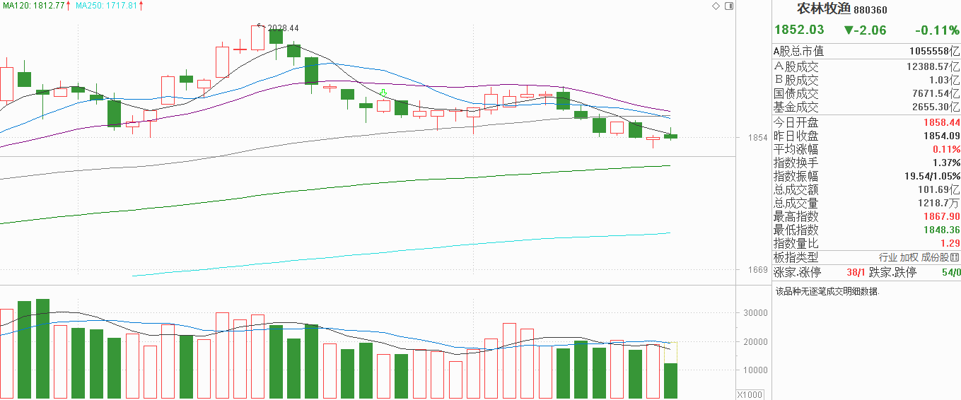 都看看农业啊!昨天小阴调整一度创调整新低,尾盘受指数探底回升收出带下影线的十字星,昨天指出,当前农业出现持续下行是止损筹码因为市场情绪转弱主动离开导致的,市场回暖后止损筹码自然会减缓离场的意愿。但农业的上涨并不受止损筹码不流出影响,而是需要有增量资金流入,如果市场依然缩量,情绪都没有彻底好转,农业无论从资金面还是情绪面还是不占优势,在下跌趋势中出现横向震荡我认为是合符逻辑的。今天农业高开冲高与指数分时波动很像,但就涨了一段现在又是冲高回落,虽然上影线不明显,但对应昨天也不明显的下影线,说明多空力量是平衡的,即只要市场无法重新放量,农业本次止损筹码流出会告一段落,复制9月底至10月初完全没有波动的概率很大,这只是极弱势行情下的影响,并不属于主力护盘的结果,我们得区分出来。