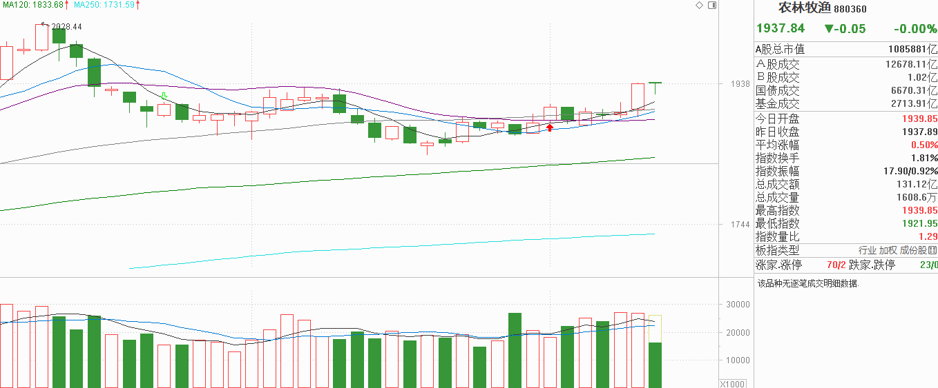 农业的朋友们,都给我睁大眼睛看看!昨天中阳反弹明显是有资金流入的,因为此前农业一直处于混沌状态多空平衡,均线粘合在一起并不像白酒那样全在下方,出现资金流入后平衡就被打破,有概率继续上行。今天农业高开低走小阴调整后回升,5天线承接还很强,但没有看到持续有力度的资金流入,未能形成第二根中阳反弹,走势比预期要弱一些。当前农业回升我认为是昨天进场的资金还没有选择离开导致的,如果昨天进场的资金认为农业也就这样重新流出,农业再回到此前横向震荡平台也是预期内的事情。现在的行情就很明显了,有资金流入农业就能盘活,没有资金流入农业依然是横赂震荡。此外,按农业的习惯,三天两中阳也可以接受,因此明天还可以观察,如果明天还是窄幅震荡重心没有上移,那就是没有更多的资金流入,看成是震荡市遇阻就能离场了。