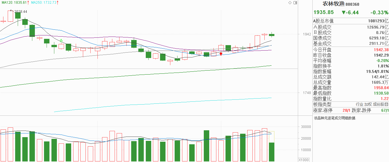 农业的朋友们,我必须给你们提个醒!昨天高开低走后回升收了带长下影线的星线,其实就是9月底无序震荡的延续,今天窄幅震荡,已经封住了农业三天两中阳资金流入的基础,代表周一阳线也不是资金的流入,只是存量资金在行情回暖后回到前一周期平台的修复。对于农业来说,别管到底是涨是跌,资金流入才是核心,只要看出是存量博弈,无序震荡就是大概率,这种没趋势的周期,涨可以跌也行,虽然不费资金,但费的是时间,就算是银行这种小波动都能跑赢无主力的农业,由此可见农业已经沦为真正的消费风格了(白酒并不是消费风格,是红利风格)。所以农业什么时候有机会也很清晰,真资金流入产生中阳异动,而且能持续两至三天,就是主力想启动农业的信号,在此之前,每天看一眼就够了。
