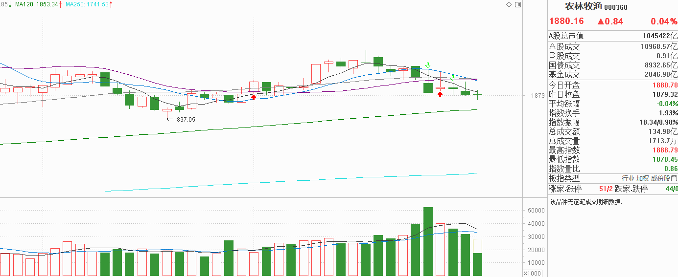 农业昨天低开高走至20天线附近又回落至5天线下方,连续四天都有上影线,代表5天线本身是有阻力的。今天农业高开后探底回升重回5天线,我觉得是5天线的抛压基本消化完成。不过农业近期只是市场情绪的温度计,今天指数已经收复5天线向10天线进发,农业居然连5天线还没有明确修复,说明市场情绪比预期还要弱,再叠加农业这样的低波动,更没有多大的吸引力。单论农业来说,那怕今天探底回升大阳线重新突破20天线并回到11月高点又如何?这个波动太少了不可能会吸引大资金参与。因此农业目前依旧只是市场情绪的温度计,现在指数走强市场情绪并没有跟随意味着这只是结构化行情,得观察资金流入的方向。从目前的数据看,科技方向资金关注度更高,像农业这种带消费属性的板块,走势就相当弱,如果没有资金持续流入,继续看震荡空间也不大,只能继续观望了。