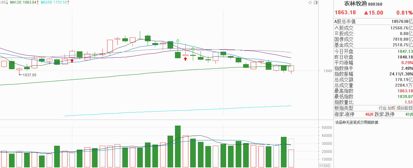 看看农业昨天受半年线压制小阴调整反包周三的小阳线,5天线开始下穿半年线,形成新的阻力区,今天农业探底回升后尝试反抽半年线,我觉得没有多大意义,因为本周走势就是涨一天跌一天,市场重心不断下移,实际上就是阴跌状态,只要今天阳线力度不足以把多日阴线全部收复,下周一说不定又是阴线表达。此外农业还是市场温度计的特征,昨天创新低符合市场冰点特征,今天对应大部分个股拒绝下跌也是真实的,但农业今天的上涨空间太少,对应的拒绝下跌气氛也不强,这种偶尔的回暖能不能出现持续就如技术上阴跌状态一样,没有必然的结果。两种情况暂未支持农业企稳回升,代表市场情绪依然处于冰点附近。我的做法是,不要去预测冰点何时融化,融化了农业自然会走好,更不用猜农业有新资金流入,近半年来就没有出现过这情况,完全不担心农业会出现踏空,走强了再看好并不迟。