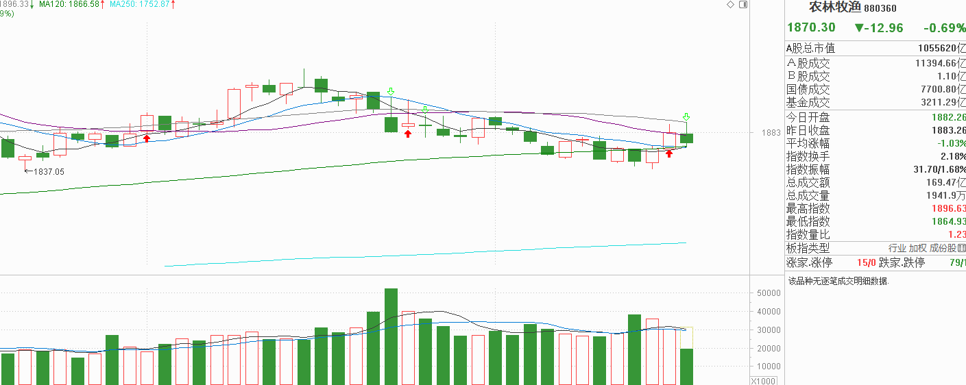 农业昨天小阳反弹一度挑战下行的60天线,但并没有完成任务冲高回落至20天线附近,今天再次冲高60天线也无果小阴调整把20天线也丢了回到半年线附近,说白了这只是农业在半年线两天60天线间的无序波动,昨天突然走强只不过是题材的轮动刚好转到农业方向,可是农业本身并没有新增资金流入,存量博弈涨一天跌一天本就很是正常。此外,农业还有市场温度计的角色,昨天市场调整,农业居然是小阳反弹,本身就是矛盾的,反弹力度偏弱没有持续,明显就是诱多信号。当然,诱多不代表农业会破位走弱,毕竟这个题材今年就没涨过,还先于指数在9月就走弱了,市场抛压早就出清了,留下的都是铁打不动的存量资金,我觉得农业当下的波动比大于前一周期,如果将来出现新增资金流入突破了60天线,说不定真能改变现状,但没有持续的中阳反弹前,我会以极窄幅区间震荡来看待,即依然是打酱油行情,涨了不用高兴,跌了也不用失落,顺其自然吧。