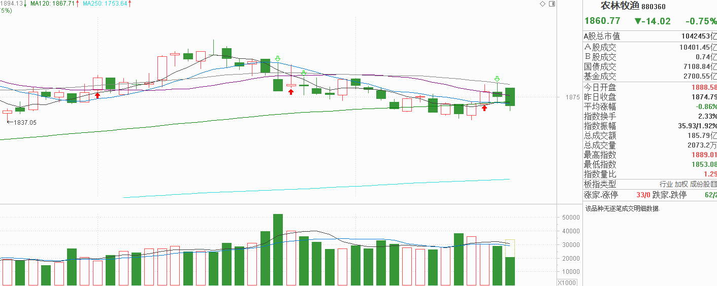 农业昨天围绕20天线出现宽幅震荡,上影线触及60天线,下影线又回踩半年线,这是箱体震荡表现,而且多空是平衡的。今天农业竞价是高开的,由于均线已经粘合,我还以为今天是农业向上突破的起手式。结果农业帅不过半天,直接高开低走大阴回调击穿半年线,阴线力度是近两周来最大的,说明压盘资金又来了。为什么是压盘资金呢?因为农业这两个月是阴跌行情,这一年基本没涨,压根就没有获利盘,昨天,今天都是市场冰点,农业作为市场情绪温度计,虽然也会受影响,但不会出现更大力度的回调,今天的高开低走大阴线就显得非常造作,有点此地无银三百两的即视感。我认为农业既然没有获得盘,大不了就是围绕半年线继续弱势波动,向下破位,向上突破的条件均没有形成,而且均线粘合区间很窄,也没有做价差的空间,我的观点是继续观望,别管农业这种压盘的假象。