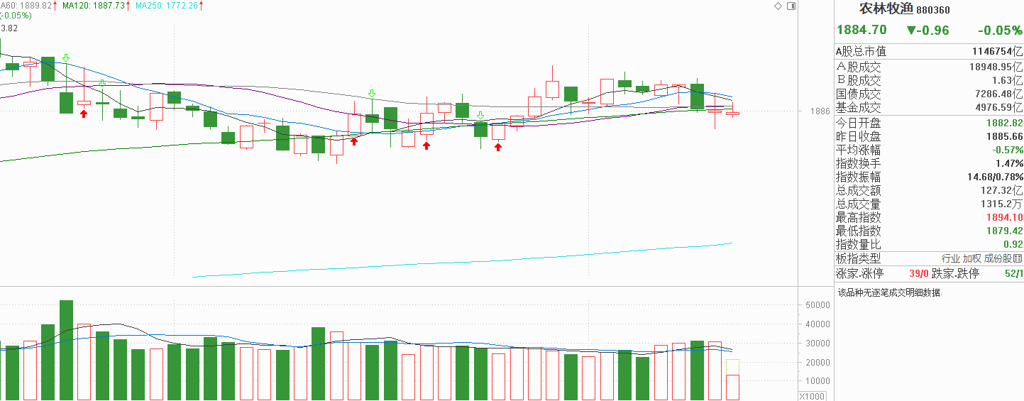 农业昨天冲高反抽5天线,中午被消息打压冲高回落,但尾盘又能探底回升,收出比较宽幅的区间震荡,我认为是多空平衡的表现,主要原因是农业近三个月横向震荡没有多大的获利盘,区间波动少两融筹码估计也不多,虽然有利空消息但抛压也不大。今天农业低开后再次尝试冲击5天线,其实也没有上涨力度重新冲高回落。本周指出过,农业目前的唯一意义是观察是否出现补涨行情。今天市场热度明显下降,也没有资金愿意流向农业,到底代表当下行情未结束,还是就算结束了也不流向农业,目前我也不知道,但农业没有波动,短线我认为对我吸引力是不大的。
