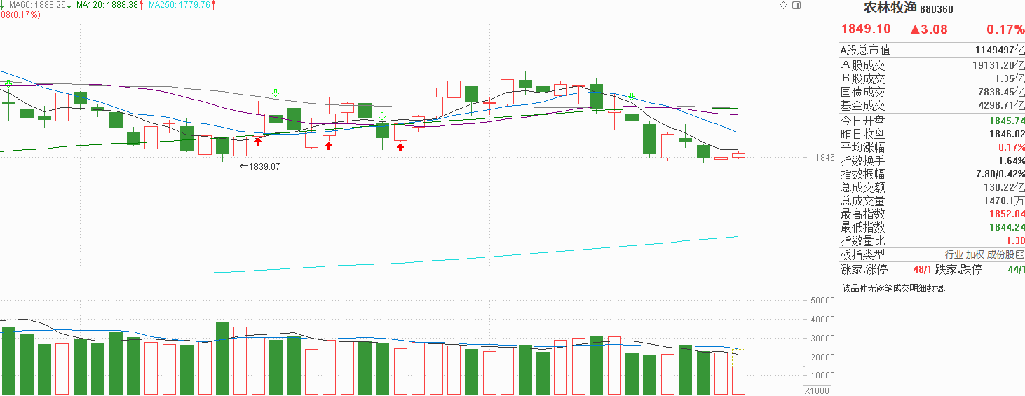 农业昨天窄幅震荡,位置就在12月箱体底部平台,这个位置的支撑是比较大的。今天农业窄幅震荡,还是在箱底附近,5天线依然没有收复,我不认为是资金流入的信号,只是现在市场涨多跌少,人气比较好,农业跟随出现微涨和应,基本的上涨力度是可以忽略的。我不知道为啥农业会这么弱,但资金既然不流入,就没有办法进行反弹。农业还有一个比较不好的地方,它半年都没有异动过,箱体区间也很窄,即只要其它科技板块偶尔出现的中阳线,就相当了于农业从箱底到箱顶的波动周期,如果整体市场没有主线农业还有资金愿意试试,但现在大部分板块表现都不错,这种低迷而且天花板极低的题材,实际上是吸引不到资金青睐的。没资金流入农业,那就继续只作观望好了。