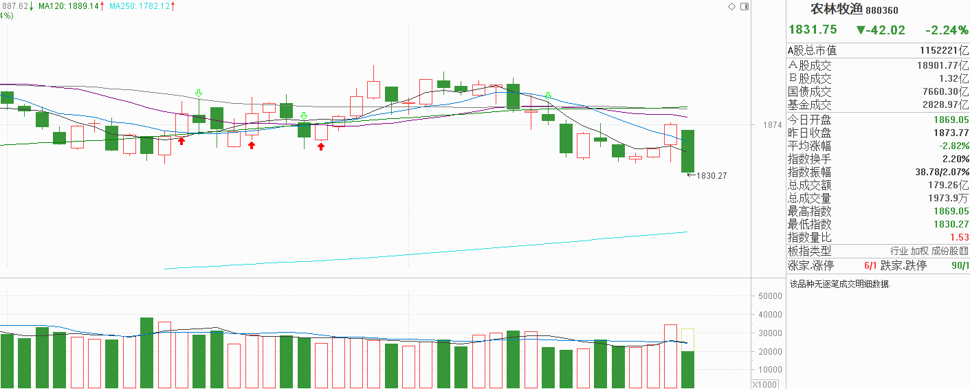 农业昨天高开探底12月平台箱底后回升小阳反弹,居然还收复了10天线,阳线力度强于1月19号,如果今天可以出现第二根有力度的小阳反弹,说不定就能突破60天线重新回到震荡箱体的中位区。但农业完全没有资金面的支持,今天市场涨停板基本消失,压根就没有做多力量,是情绪的冰点区域。农业低开低走以中阴线把昨天探底回升小阳线反包了,这种走势明显是一日游的表现,而且做多动力明显弱于做空动力。由于12月震荡平台的箱底已经被击穿,农业虽然已经躺平,但不排除全市场情绪极速降温下的瞬时走弱,但大方向上农业筹码就在这个区域,要破位也不容易,但想反弹也挺难,虽然回到箱底也没啥短线吸引力。