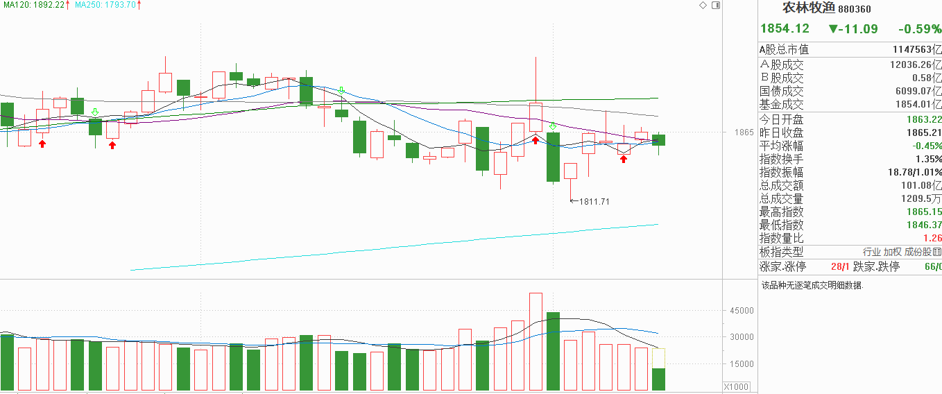 农业昨天小阳反弹没有力度,虽然收在5天线、10天线与20天线上方,但在60天线下方,5天线与60天线的区间也很窄,就算今天继续上涨,阳线力度也是很小的。今天农业低开低走小阴调整,力度也不算大,但就这样一根小阴线,能把连续四天的反弹全部都反包了。由此可见,农业本身没有资金流入,存量资金在节前要跑的已经跑了,要留的本身就不会砸盘,导致无论是市场普涨,还是出现分歧,农业的市场重心没有发生变化。我不知道农业什么时候会出现异动,但出现异动一定会在盘面有表现,或者是中阳反弹突破所有均线,或者是大幅放量,这些都是可以观察出来的,我不认为这种横向震荡是主力有意为之,这是没有主力,大家别搞混了。