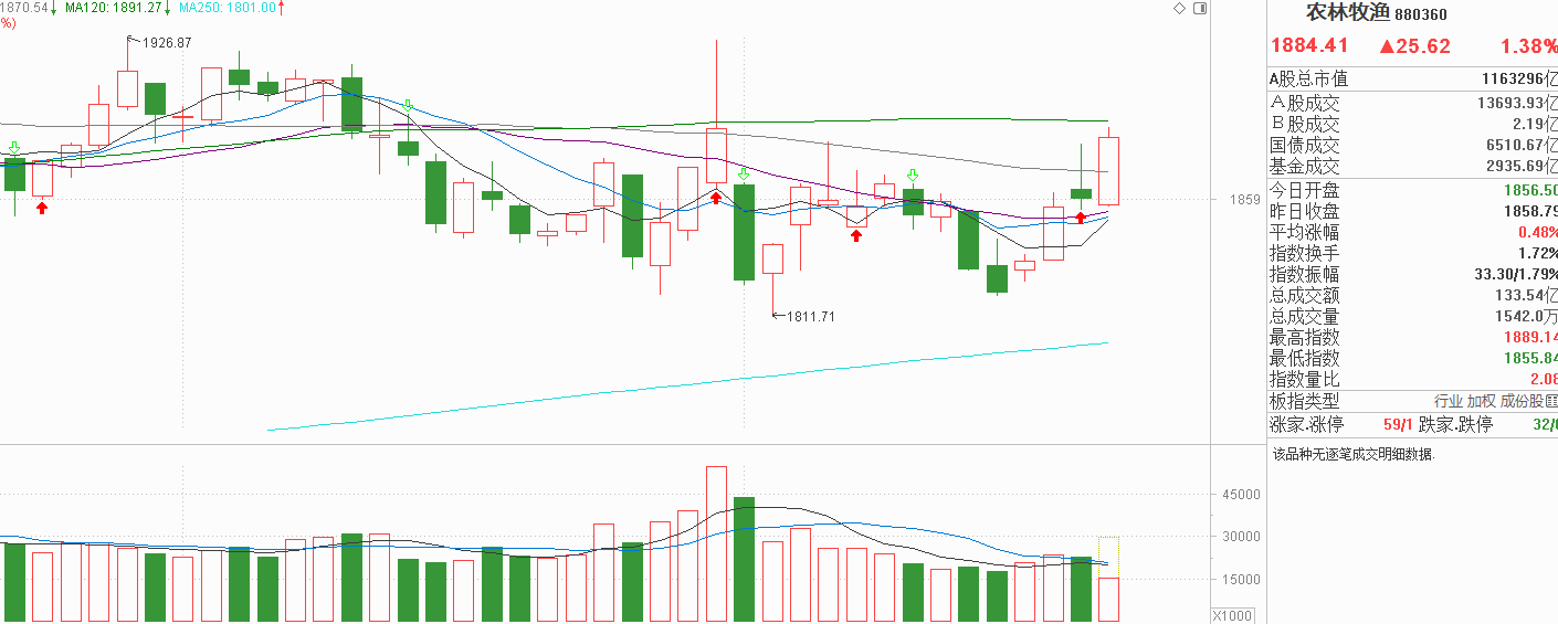 农业昨天高开后一度站上60天线,但午后已冲高回落,上影线比较长,而农业又是长周期的震荡市,可以认为60天线是有一定的抛压,正常情况今天向下探找支撑是大概率。农业今天低开后并没有向下回踩5天线,而是重新走高修复昨天的上影线并向半年线测试,这种走势有超预期的成分,像昨天那样,能不能维持到尾盘并未知道。退一步说,就算农业今天出现中阳线反弹,由于昨天,周二都没有中阳,并不是资金流入的信号,今天即使中阳也只是第一天出现做多信号,下周一能不能持续依旧是未知数。按农业近一年来就是横向波动,我认为农业大概率回到12月高点后就会掉头向下,没有必要看到一根中阳线就认为农业可以走强提前潜伏,说不定现在就是箱顶,那就变成追涨了,一旦回落就会有亏损的风险。