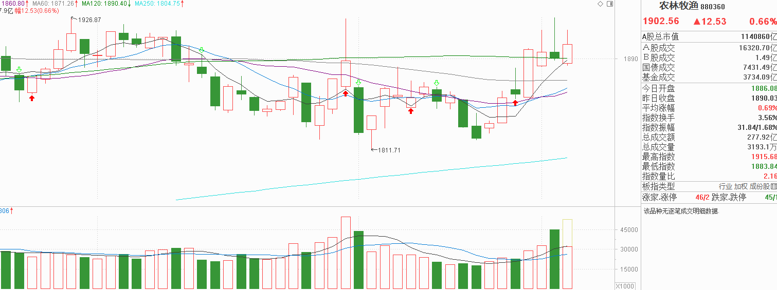 农业昨天一度中阳反弹至12月高点,但并未成功维持至尾盘出现冲高回落,要知道周一也是冲高回落带上影线,连续两天上影线加上本身只是横向震荡箱体,我认为今天向下击穿5天线探找支撑才是正常的。但农业今天低开后并没有继续下探,而是重新走高依旧站上半年线上方。这种走势是异常信号,起码说明震荡市特征在失效,短周期内应该有资金在流入农业,但又未有足够的做多动力让持续中阳线出现,属于能抗住箱体抛压但未能形成突破。在这种情况下,我认为可以慢一点,如果今天中阳反弹有效,重新看涨农业是可以的,但还是冲高回落,那就说明震荡行情依旧,该止盈的还是要继续止盈,千万别被短周期异动认为农业一定会走强迷惑了。