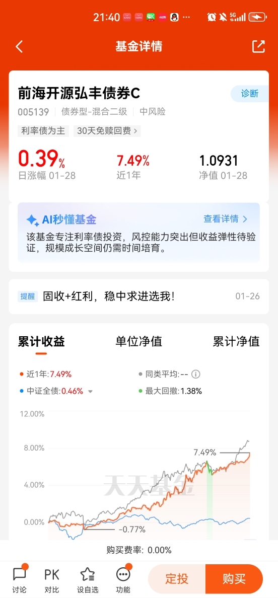 就像我学着在工作间隙挤出时间陪伴家人,在孩子入睡后复盘工作、提升自己,找到属于生活的节奏;$前海开源弘丰债券C$ 也在市场的变化中,以专业的投资策略把握节奏,用债券的稳定打底,用适度的进取博取收益,兼顾防守与进取 。它成为我理财清单里的“定海神针”,就像合理的时间规划成为我生活里的“平衡支点”,让我不用再为资产的波动焦虑,也能更从容地面对工作与家庭的双重考验。
