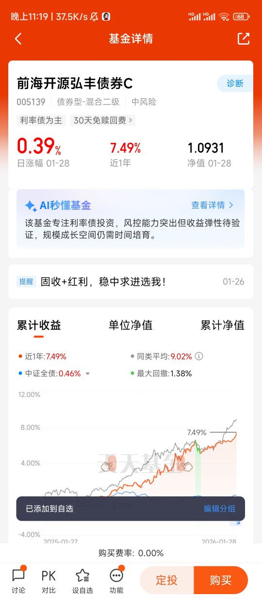偶然听朋友说起前海开源弘丰债券C,说它像理财里的“压舱石”,波动小、收益稳。抱着试试的心态投了点,没想到真没让人失望。不用天天盯着盘面,也不用担惊受怕净值下跌,打开App总能看到稳步上涨的收益。