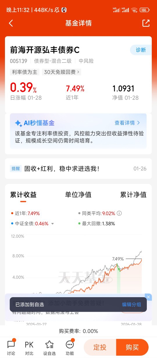 偶然了解到前海开源弘丰债券C,零申购费的低门槛让我敢于尝试,而债券占比超80%的稳健配置,恰好契合我“求稳为主、适度增值”的需求 。我每月定投工资的十分之一,不用紧盯净值波动,基金经理的专业管理让我省下心力陪伴家人。
