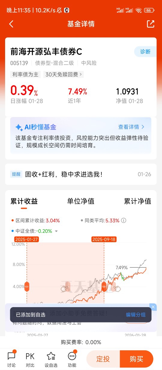 偶然了解到前海开源弘丰债券C,0申购费的低门槛让我大胆尝试,每月定投工资的10%。它80%以上的债券持仓打底,搭配少量权益资产增强收益,就像生活里的"定心丸"——净值波动平缓,不用时刻紧盯行情,更能专注陪伴孩子成长。