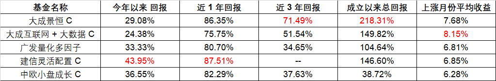 另一只值得关注的“长跑能手”是大成互联网 + 大数据 C,同样在近3年、成立以来回报中稳居第2,而在上涨月份平均收益中则获得第1,作为一只指数型产品能与主动型产品一较高下实属难得。