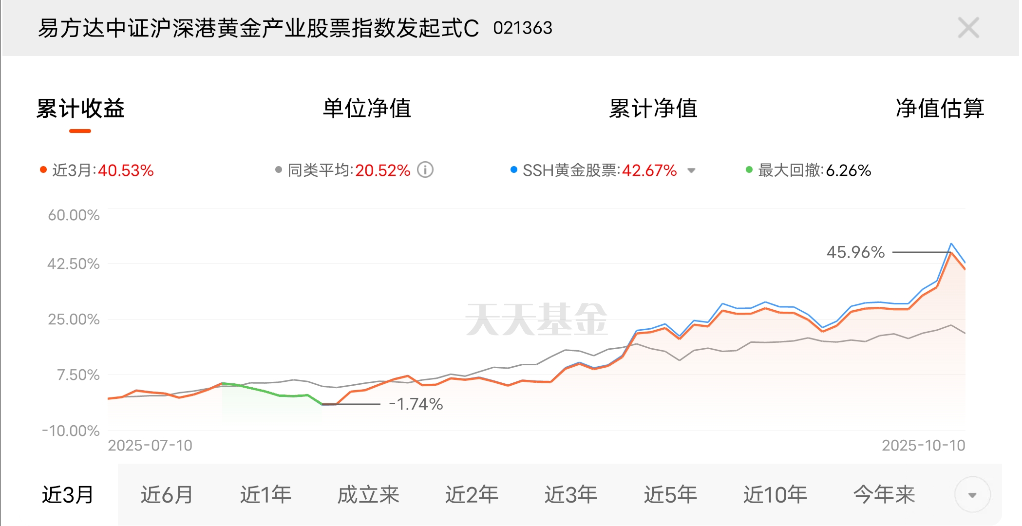 黄金的抗通胀属性现在太重要了,大家都在买,行情一路走高。易方达中证沪深港黄金产业股票指数C近3个月40.53%,持仓的偷着乐,没进的快上车。