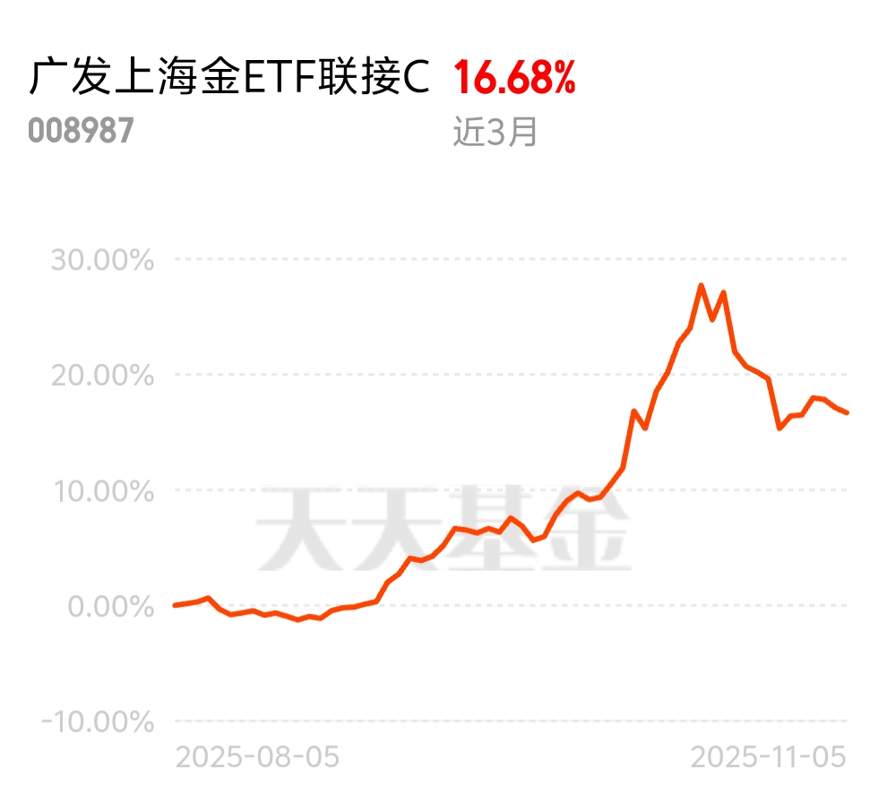 不用等着后续行情观望了兄弟们,黄金行情本来就慢牛,一时半会儿走不完的,看好$广发上海金008987$1年涨幅接近45%,继续加仓!