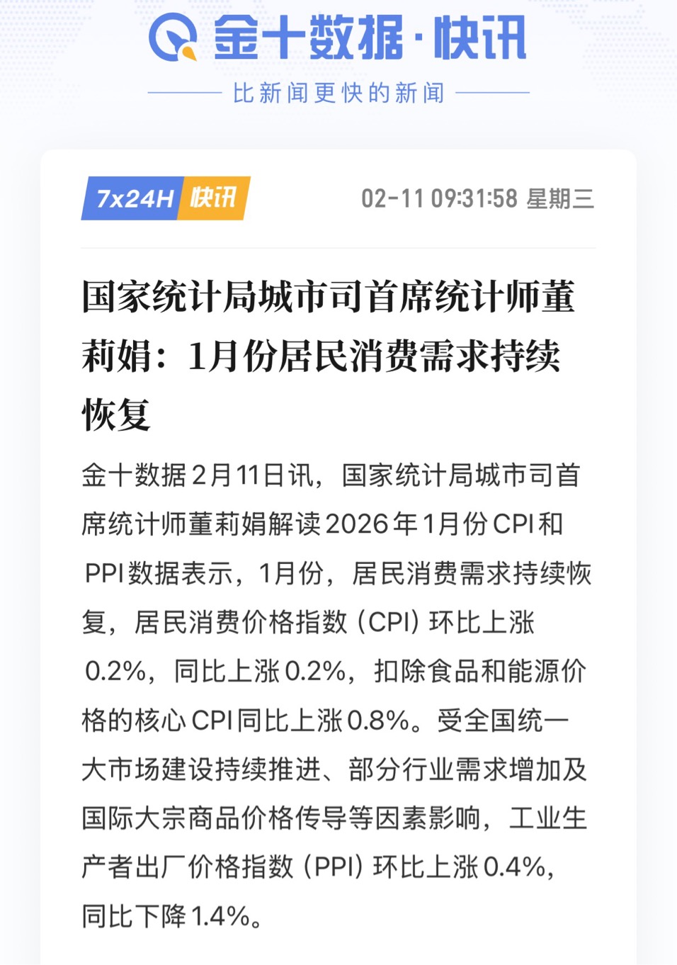 当下的数据正在印证这个传导链条。根据国家统计局的数据,2026年1月,PPI同比下降1.4%,但环比已经连续第四个月上涨,涨幅为0.4%。这表明工业生产端的价格改善趋势是明确的。与此同时,1月CPI同比微涨0.2%,虽然受春节错月影响涨幅不高,但核心CPI保持温和上涨,显示居民消费的内生动力正在逐步修复。PPI和CPI之间的“剪刀差”在持续收窄,这意味着产业链上的利润分配正在从上游向中下游的消费端倾斜。简单总结就是:当PPI上涨时,受益的是化工、有色这些上游顺周期方向,它们会率先启动;而当CPI上涨时,就轮到消费板块表演了,随着终端产品价格提升和需求回暖,消费企业的盈利会得到改善,股价自然也会有反应。这也是为什么近期越来越多的机构开始重新审视消费板块。大家其实都在等待一个更明确的信号,那就是CPI数据的持续好转,等待价格传导的逻辑真正在财报上“落地”。