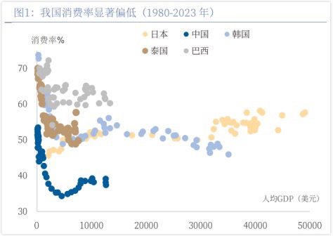 不仅必要,消费的提升空间更是巨大。从消费率(居民消费占GDP比重)来看,我们的潜力远未被释放。2023年,中国居民消费率仅为39.1%,不仅远低于全球平均水平(56.6%),也显著低于美国、德国、日本等发达国家。即便是与同属东亚文化圈、同样有储蓄习惯的日本和韩国相比,我们的消费率也明显偏低——历史上,日本的居民消费率最低点也维持在50%以上,韩国则基本稳定在48%-50%区间。这说明我们的消费潜力被压抑已久,未来提升的空间就是投资的潜在空间。