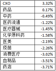 上周医药跟随大盘风格,成长科技风格相对较强,从细分子行业来看,创新药产业链的CXO和药品跑赢全指医药卫生指数,依旧延续子版块轮动较快的状况,这也与大盘各行业板块轮动的状态一致,主线行情还需等待政策或者行业基本面更大的催化。