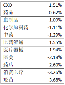 上周医药跑输大盘,从风格看依旧是资金快速轮动的结果,在成交缩量的背景下,前期涨幅较多就面临短期回调压力。从细分子行业来看,创新药产业链偏强,CXO和药品跑赢全指医药卫生指数。