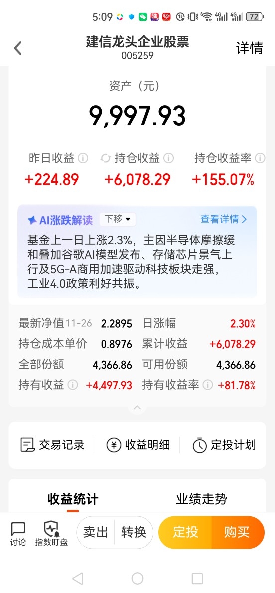 建信企业龙头是持有最好的一只基金,刘克飞经理好样的