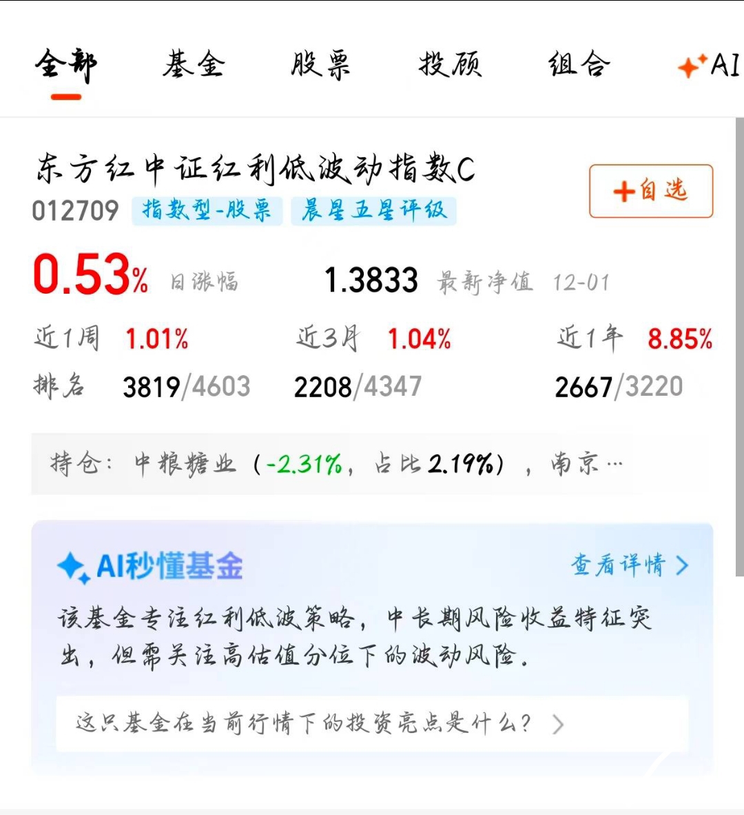 在当前点位,我组合里增加了东方红中证红利低波动指数C的配置。看中的就是它波动相对