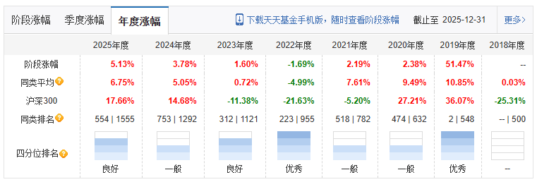 • 长期正收益:基金成立于2018年1月26日,截至2026年1月23日,累计净值达到1.9066元,成立以来总回报超过98%,年化回报约9%左右,远超同期银行存款和部分纯债基金。在2025年市场震荡中,仍取得了5.13%的正收益,而同期沪深300仅上涨1.57%,超额收益显著。