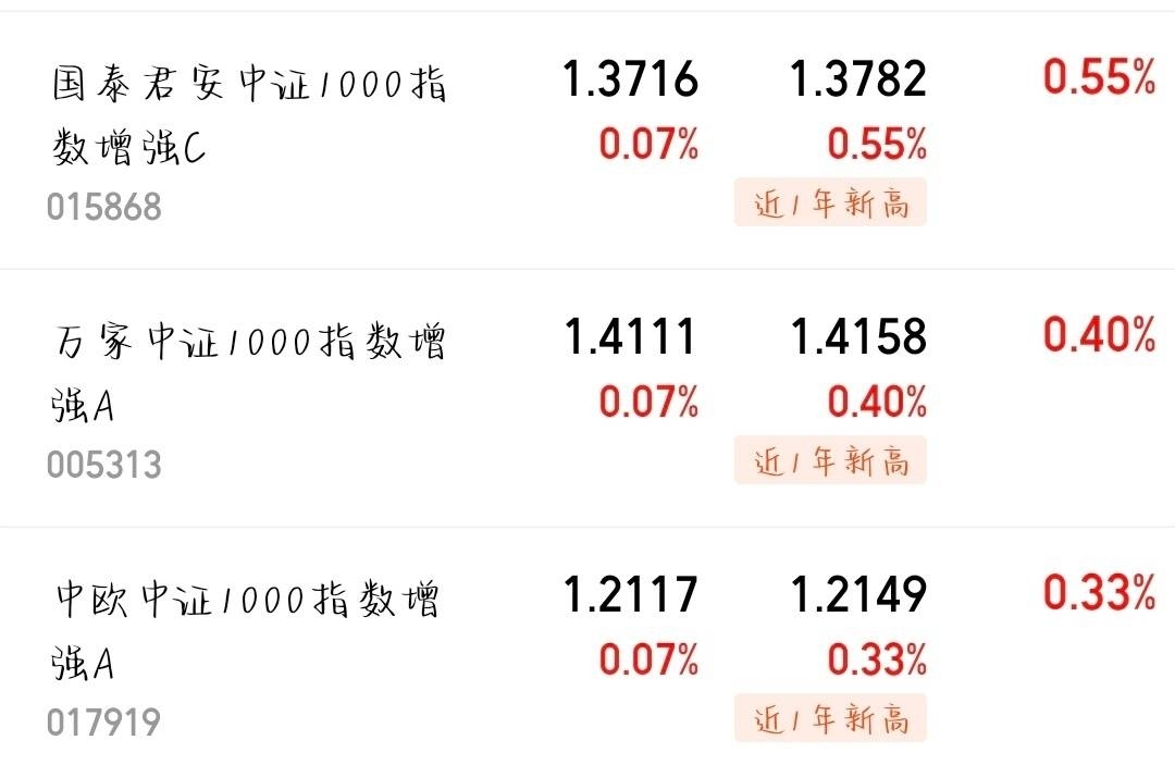 基金市场的实时行情一刻不停地发生着变化,每只基金的净值时涨时落,始终处于波动之中,不同板块的表现差距也依旧明显。若想了解当下哪些基金走势抢眼、表现出色,哪些又暂时势头放缓、活力稍弱,接着往下看,这些情况便能轻松弄明白。$国泰君安中证1000指数增强C$ 今日上涨0.55%$万家中证1000指数增强A$ 今日上涨0.40%$中欧中证1000指数增强A$ 今日上涨0.33%
