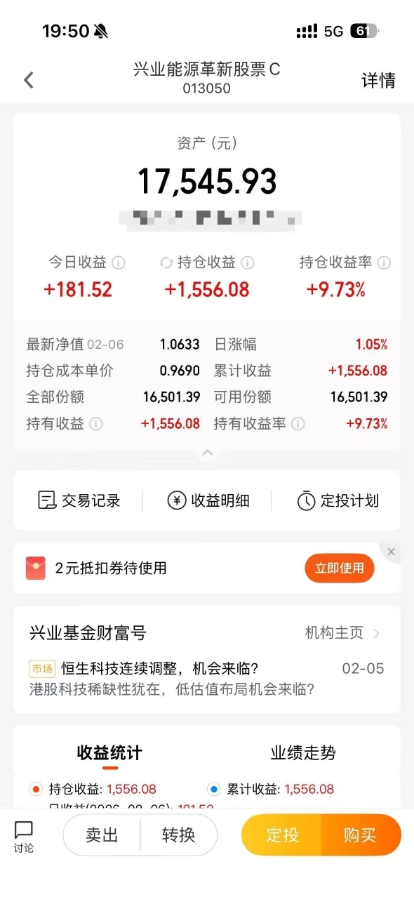 诶怎么隔壁兴业电池今天红的,兴业能源革新股票C近1年40.61%,行情给力,能源
