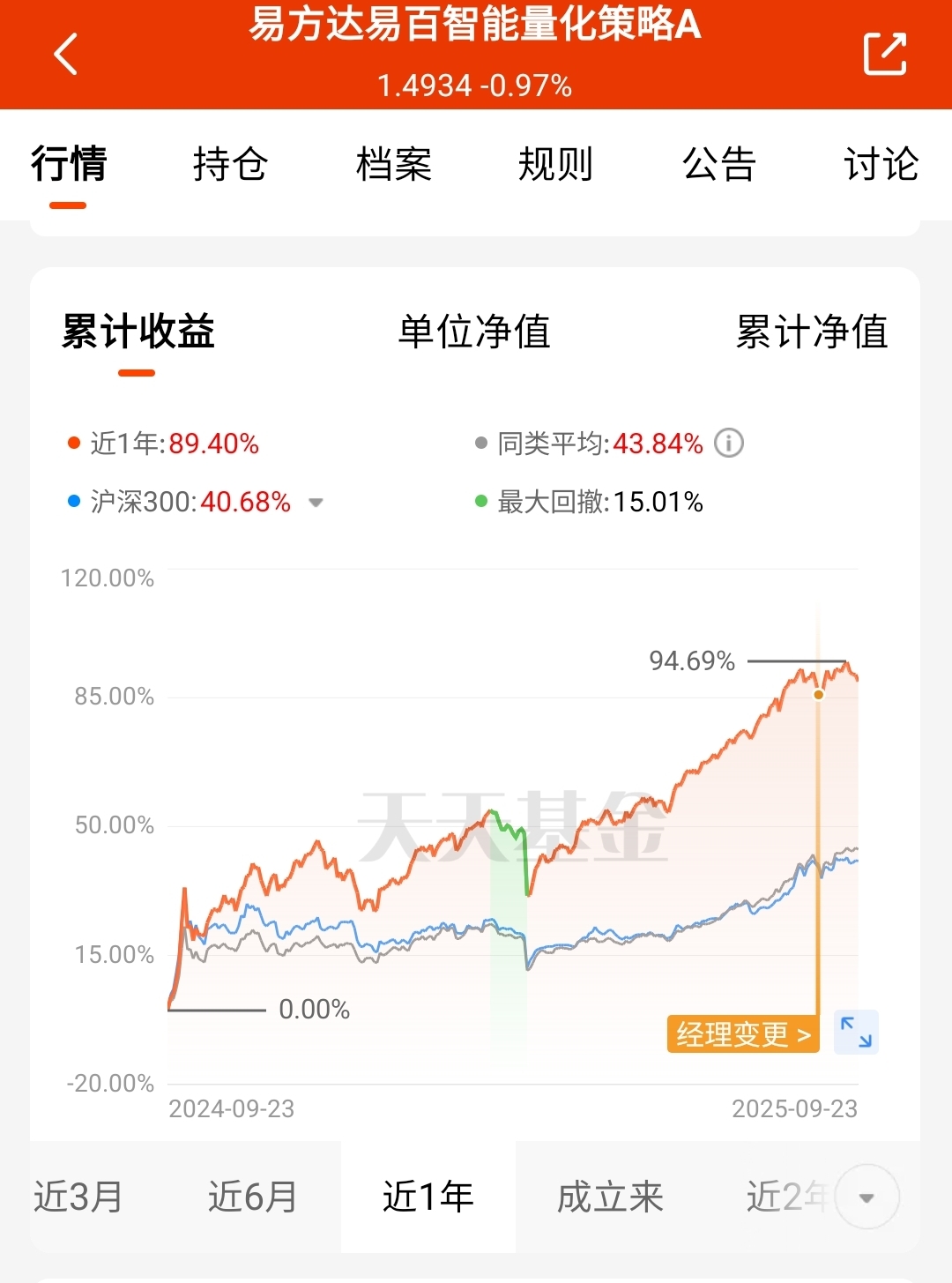 在牛市行情里板块轮动快,量化策略就不怕轮动,通过高频调仓紧跟行情呢。$易方达易百智能量化策略A(OTCFUND|005437)$就是采用量化策略,近一年涨幅89.4%,跑赢大盘指数呢,值得关注。