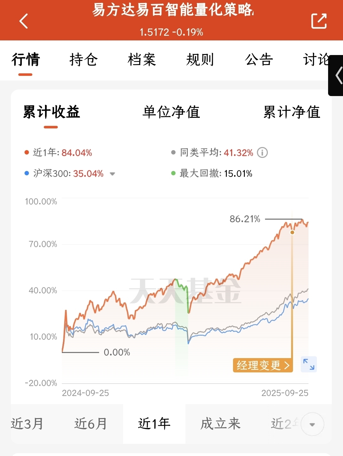 板块轮动,不知道买什么赛道,那就买量化基啊!$易方达易百智能量化策略A$ 策略表现优异,长期稳定跑赢大盘,在牛市行情中更能放大收益。该产品采用高频调仓机制,灵活应对行业快速轮动,持续领先市场表现。近一年业绩走势稳健,上涨了84.04%,收益体验良好,是牛市行情的理想配置选择,能有效避免踏空风险。