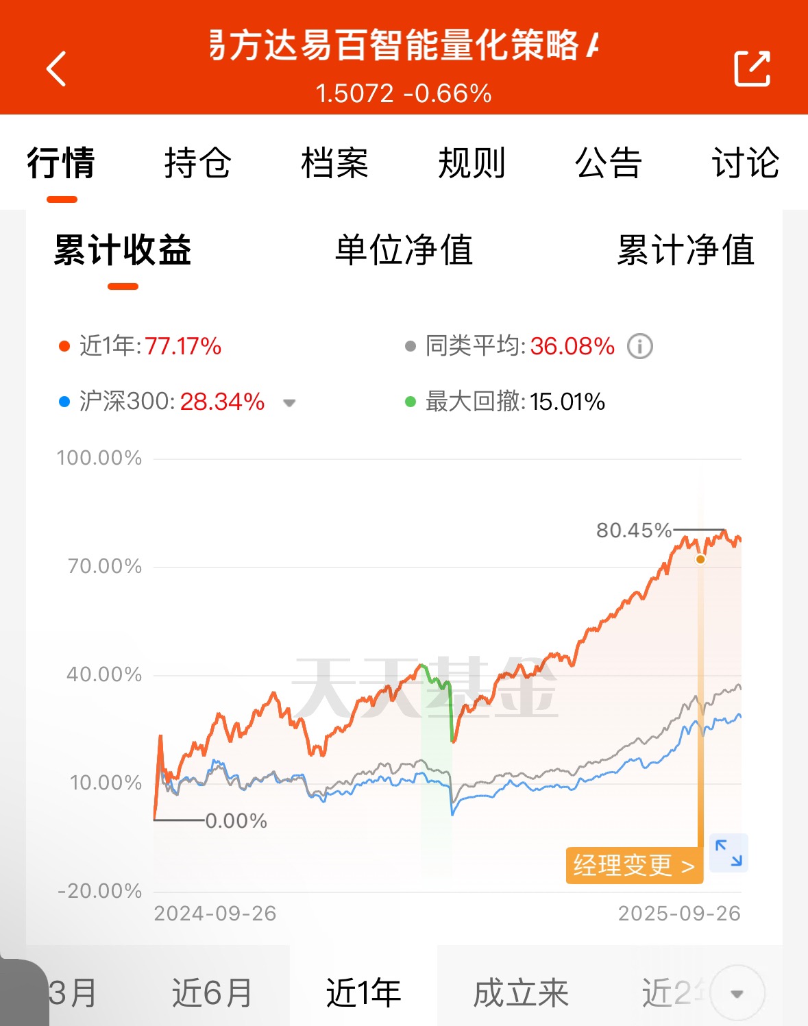 兄弟们,节前最后的两个交易日,今天券商带头冲锋,前期抛出的小伙伴是不是要后悔了?幸亏我前几天抗住了,不过前几天的震荡确实很搞心态,但是今天以后我觉得就不一样啦,券商一马当先,这是剑指3900的姿态啊,我今天准备加点仓了,我准备再加一笔$易方达易百智能量化策略A$ ,这个业绩做的还是不错的,近一年涨幅达到了77.17%,远远跑赢沪深300,量化策略确实能够稳稳跑赢这个市场,我觉得后面机会多多