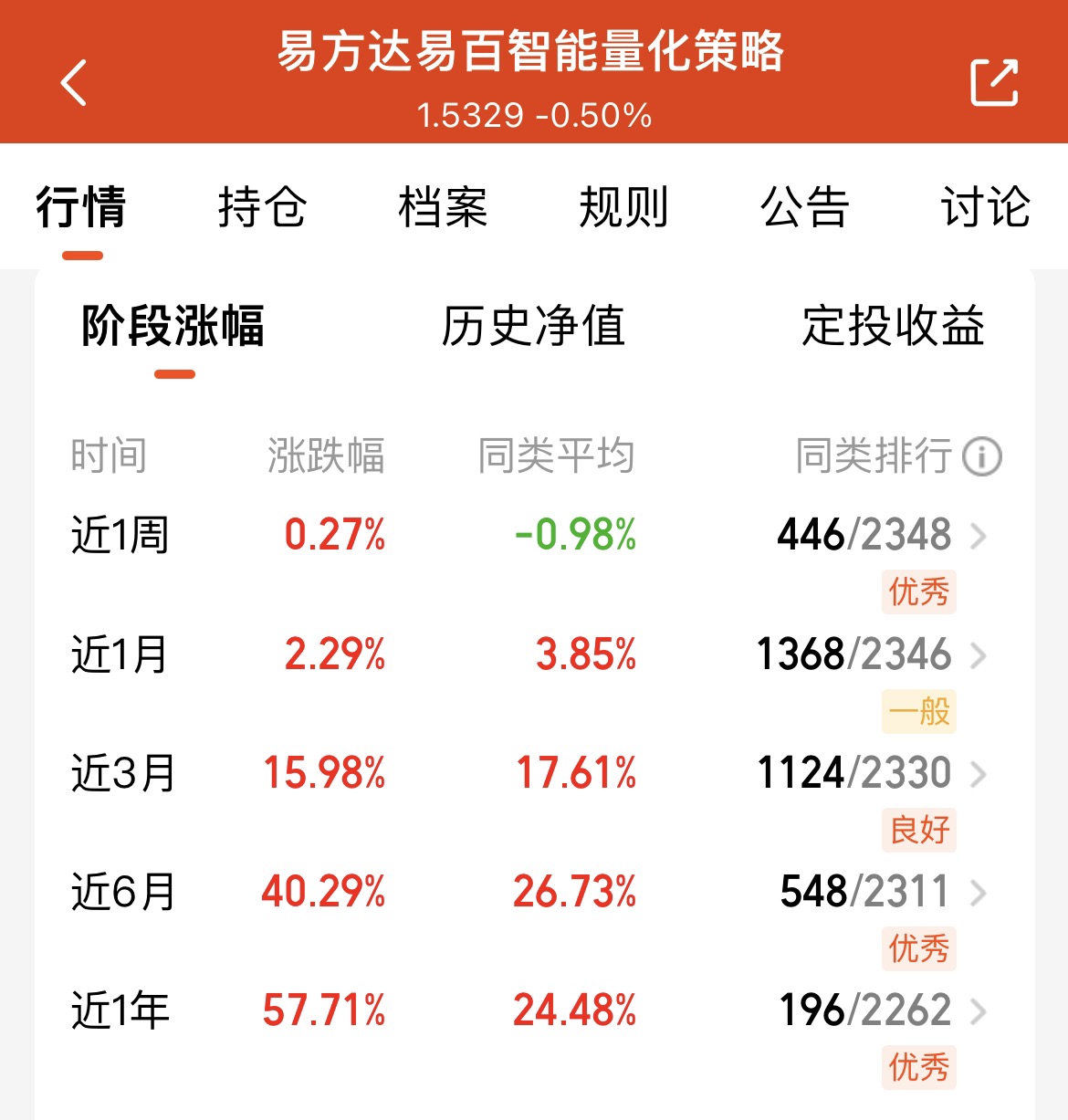 今天大盘震荡得厉害,一会儿拉券商一会儿冲科技,板块轮动快得让人眼花缭乱,好多人纠结追哪个又怕踏空。这时候就得说$易方达易百智能量化策略A$ 这种“智能选手”的好。它可不是靠基金经理拍脑袋选股,是用易方达自主研发的量化模型,结合大数据挖机会,还能动态迭代策略,对zc和行业景气度的反应特别灵。从数据看,自成立来A类净值增长率29.67%,远超业绩比较基准的9.45%,长期跑赢大盘是实打实的。