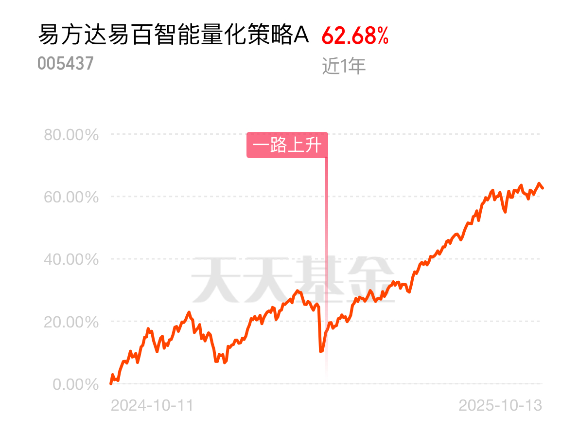 今天行情在修复,$易方达易百智能量化策略A$ 近期又新高啦,这只也是妥妥的画线派,近1年涨幅62.68%,最大回撤却只有15%。又稳又能涨,行业分散布局的优势就体现在这了,波动小,受单一行业影响不大,同时量化模型也可以根据行情变幻及时调股以跟上行情把握热点不至于踏空,做底层资产配置就蛮好的。