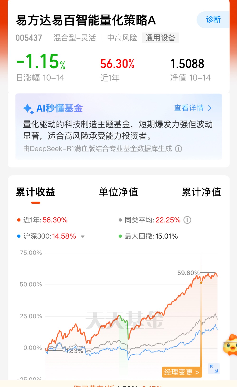 最近的行情接二连三的调整确实是不怎么样的,我的好多基金也都吃了大面,但是我觉得在上次牛市到行情当中,量化基金表现得非常亮眼,所以我的观察池里有一个易方达百智能量化策略A我是一直看好这只基金的,他的这个业绩长期来看的话是比较稳健的,今天市场行情稍微有点起色,现在这个位置还不算很高吧