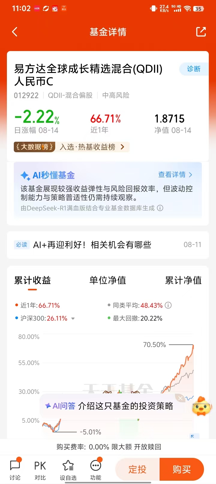 $易方达全球成长精选混合(QDII)人民币C(OTCFUND|012922)$
