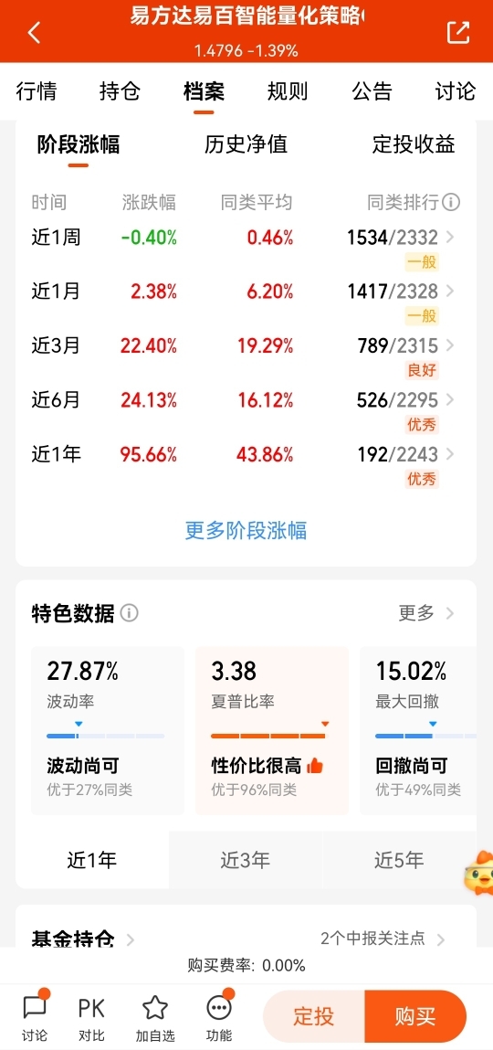 近期市场行情总是在轮动,又呈现震荡分化,当前热点还是难以把握,所以我会更看好量化产品,既不用担心轮动,还可以防止踏空,其中$易方达易百智能量化策略C$ 作为一款量化型产品,期间高度调仓,无惧行业轮动,并且收益率持续跑赢市场,近一年涨幅高达95.66%,远远跑赢沪深300收益,可以作为牛市中的放大器,我也保持长期看好态度,期待后期收益了!